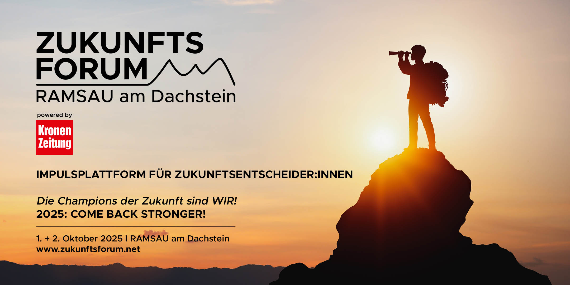 "Die Champions der Zukunft sind WIR - COME BACK STRONGER!" unter diesem Forummotto fand 2025 das Zukunftsforum Ramsau am Dachstein zum zweiten Mal statt. Unsere Vision ist es in Österreich eine Unternehmenskultur zu schaffen, wo rund um die Zukunftsthemen die Chancen im Mittelpunkt stehen. Megatrends wie Digitalisierung, Sustainability und Co sind für Unternehmen wichtiger denn je. Diese Themen richtig und frühzeitig zu implementieren wird möglicherweise zum Gamechanger für viele Branchen und Marken. Mit dem Ziel eine Plattform zu schaffen, die wichtige Impulse für die Zukunftsgestaltung gibt, wollen wir das Zukunftsforum Ramsau zu einem nachhaltigen Treffpunkt von Zukunftsentscheider:innen etablieren. Dabei spielt auch der Sport eine bedeutende Rolle - er bietet mit seinen Heldengeschichten nicht nur spannende Impulse für die Wirtschaft - er ist darüber hinaus auch in der Breite ein wichtiger Enabler für eine gesunde, gesellschaftliche Entwicklung.