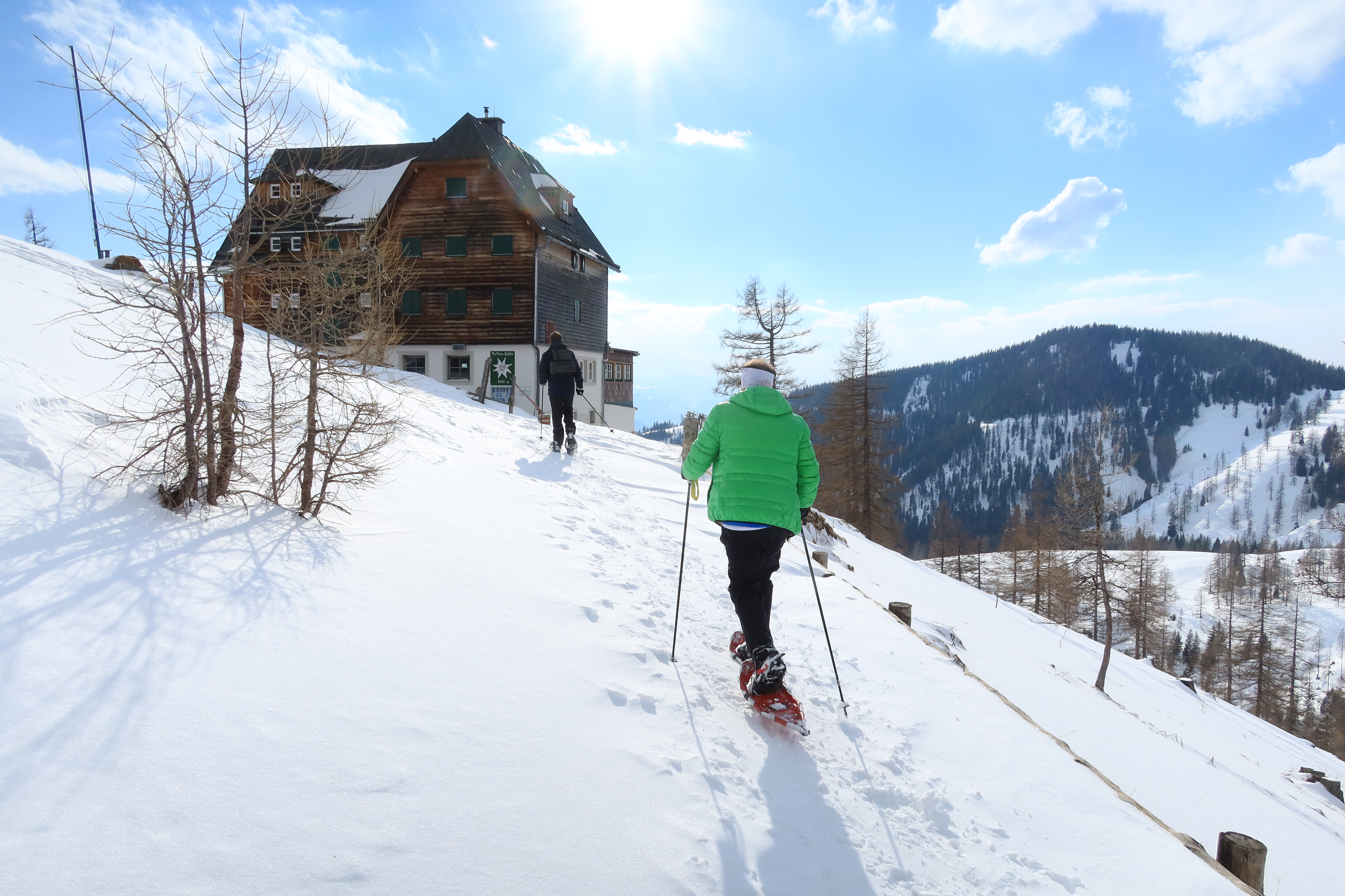 Die Sportart „Schneeschuhwandern“ erfreute sich in den letzten Jahren immer größerer Beliebtheit. Die Kombination von Natur, Sport und Spaß vermittelt ein besonderes Abenteuer. Ausgerüstet mit Schneeschuhen und Stöcken geht es im Almgebiet auf zu einer Wanderung in der Winterlandschaft. Die Route wird so gewählt, dass sowohl sportliche als auch weniger trainierte Teilnehmer:innen sehr viel Spaß an der Tour haben.